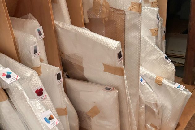 Arbeiten aus der frühesten Schaffenszeit, Klappbilder, Verlaufsbilder und schließlich, das größte Konvolut, die Spanplattenbilder: das ganze malerische Werk von Raimer Jochims wird neu verpackt und geordnet. Professionell gesichert mit feiner Tyvek-Rolle und abgepuffert mit Luftpolsterfolie, warten die Arbeiten jetzt auf den Transport an die designierte Lagerstätte.
